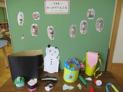 2年生は、変身の道具を紙で表現しました。思いを込めた作品には、変身する楽しさを十分に味わっていることがうかがえます。