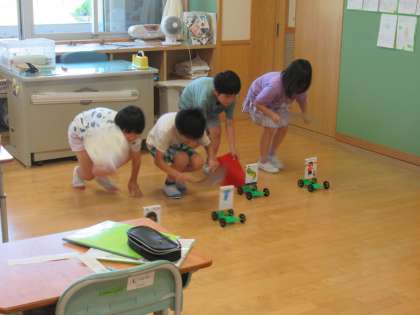 風で動くおもちゃを調べました。風の強さと進むきょりについて、関係性を考えました。