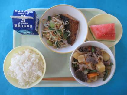 今日のメニューは、ごはん、ぎゅうにゅう、にくじゃが、さばのしおやき、いりだいずあえ、すいかです。しおやきは、かわがパリッとして、あぶらがのったおいしいさばをいただきました。また、すいかに夏本番を感じました。