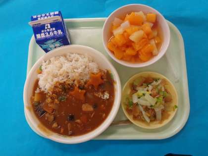 7月11日の給食は、ぎゅうにゅう、むぎごはん、なつやさいカレー、ふくじんあえ、フルーツカクテルでした。