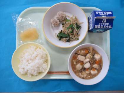 今日のメニューは、ごはん、ぎゅうにゅう、えびととうふのうまに、にくシューマイ、ナムル、れいとうりんごです。暑いじき、子供たちはれいとうリンゴをとてもおいしそうにいただいていました。