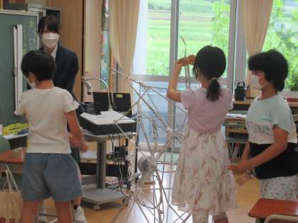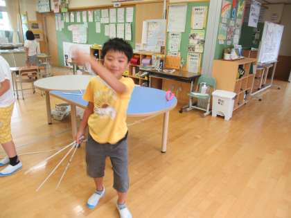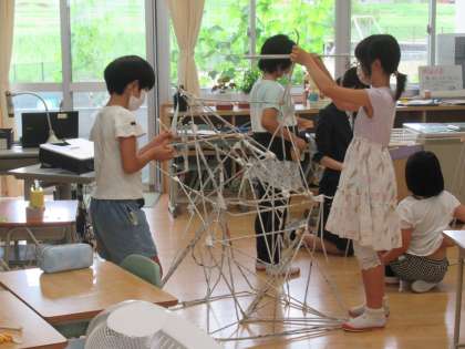 新聞紙を丸めて、作品を作りました。どんな物ができたのかな?