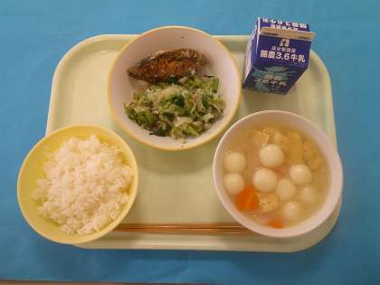 今日のメニューは、ごはん、ぎゅうにゅう、さかなのたつたあげ、ばいにくあえ、しらたまじるです。暑い日が続きますが、熱々のしらたまじるやたっぷりの野菜、魚をいただき、元気百倍です。
