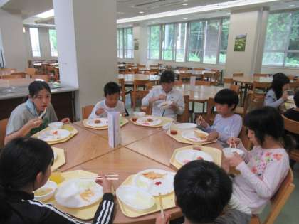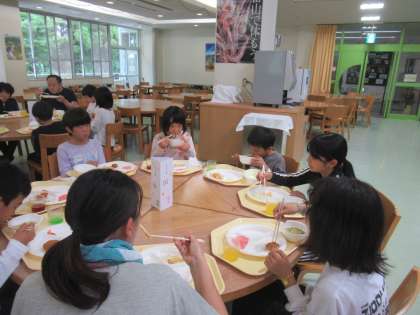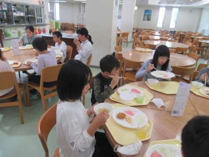 昼食の様子です。この日は、カレーライス、ラーメン、メンチカツ、そえ野菜、ゼリーでした。