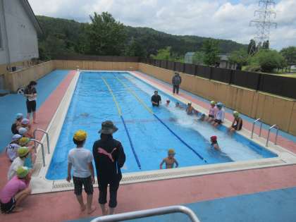 水泳記録会の様子です。体育での学習の成果が表れるよう、がんばりました。