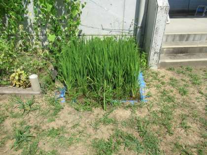 学校のヘチマがとても大きく成長しています。屋根まで伸びています。また、ミニ田んぼの稲も順調です。野菜等もたくさん育っています。
