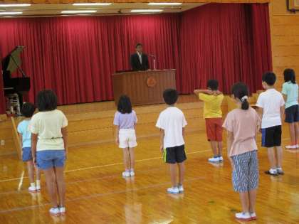 始業式では、子供たちが元気に校歌を歌いました。元気な声がかしのこホールに響きました。