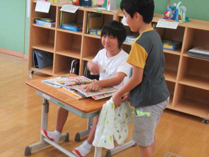 社会の学習で、商店の工夫について学習しています。今日は、ちらしを見ながら、それぞれのお店の工夫について考えました。