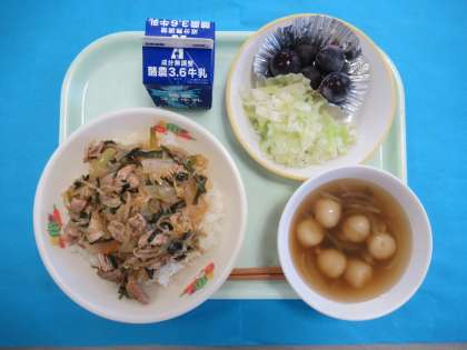 今日のメニューは、ぎゅうにゅう、ぶたキムチどん、ゆできゃべつ、くきわかめスープ、きょほうです。ぶたキムチどんは、元気が出るメニューです。きょほうは秋らしさを感じました。
