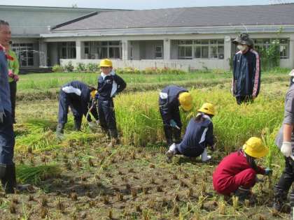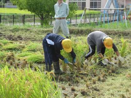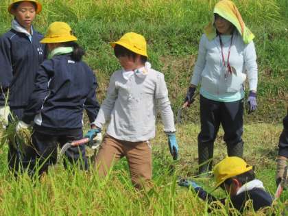 みんなで力を合わせて取り組むと、たくさんあった稲も残り少なくなりました。