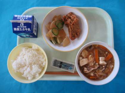 今日のメニューは、ごはん、ぎゅうにゅう、さかなのりきゅうあげ、かふうあえ、とうふのやさいあんかけ、のりつくだにです。ホキがからっとあがっており、中はほくほくでした。