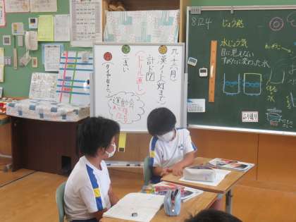 水はどこから 公開日 2023/09/13 更新日 2023/09/13 学校風景 氷水が入ったビーカーに水滴がついた現象から、その要因について話し合いました。不思議な現象について、意見を活発に交換しました。