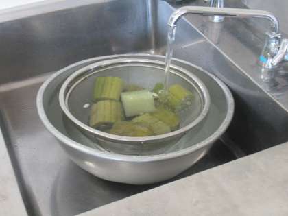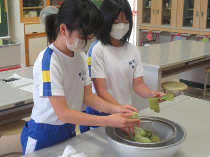 理科で育てたへちまで、たわしづくりに取り組みました。煮た後に皮がつるんとむけ、へちまのせんいがあらわれてきました。