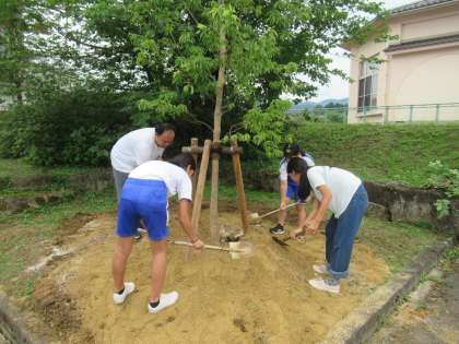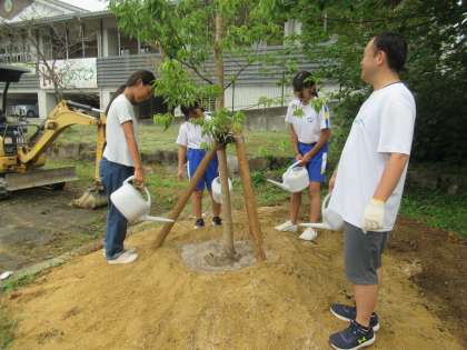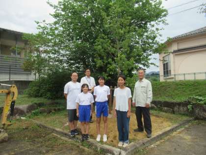 記念植樹 公開日 2023/09/26 更新日 2023/09/26 6年生 6年生が代表して、統合記念植樹式に参加しました。学校前に、シラカシの樹木を植えました。子供たち同様、ぐんぐん成長して、これからを見守ってほしいと思います。