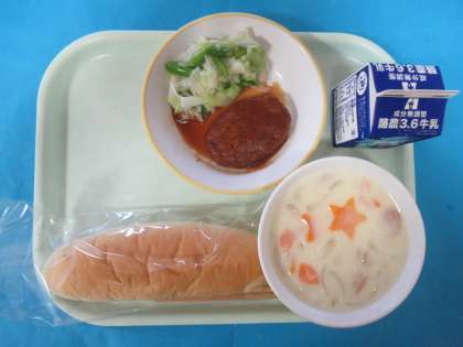 今日のメニューは、コッペパン、ぎゅうにゅう、ハンバーグのケチャップに、アスパラサラダ、ホワイトシチューです。ハンバーグには味がよくしみており、とてもおいしかったです。
