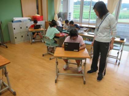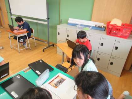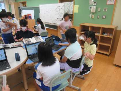 全校生活科・総合的な学習で、樫尾小学校について学習しています。この日は、昔の写真や文章などを見て、どんな学校生活だったかを調べました。