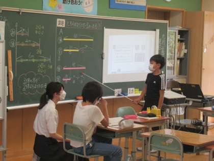 算数の時間、自分の考えを伝えています。分かってもらえるよう、工夫して話していました。
