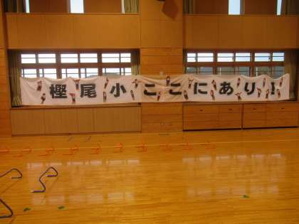 運動会で作成した横断幕です。3月まで子供たちを見守ります。