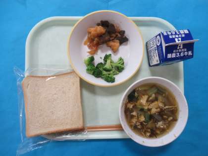 今日のメニューは、食パン、ぎゅうにゅう、とりにくとレバーのマーマレードソースがらめ、ゆでブロッコリー、たまごともずくのスープです。マーマレードソースが、とりにくやレバーの味をひきたて、とてもおいしくいただきました。