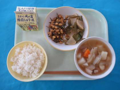 10月13日の給食は、ごはん、ぎゅうにゅう、こざかないりフライビーンズ、くきわかめサラダ、ポトフでした。