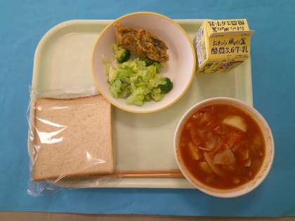 今日のメニューは、しょくパン、ぎゅうにゅう、さかのえごまあげ、そえやさい、まめとベーコンのトマトにでした。あげた魚、ゆでた野菜、煮込んだ豆やベーコン等、いろいろな食感を楽しみました。