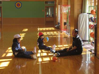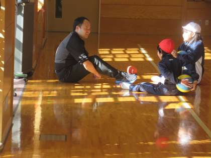 体育では、ボールを使っていろいろな動きにチャレンジしていました。