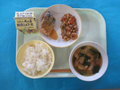 今日のメニューは、ごはん、ぎゅうにゅう、さかなのあまみそあえ、ごもくにまめ、うすくずじるです。かりっとあげられたさばに、あまみそがよくからみ、とてもおいしくいただきました。