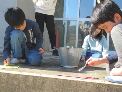 虫眼鏡で光を集めて、何色の紙がよく焦げるか調べています。光を集めることに集中していました。