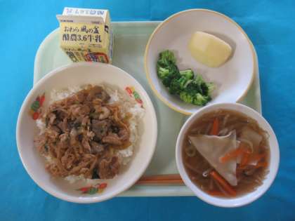 今日のメニューは、スタミナレバーどん、ぎゅうにゅう、ワンタンスープ、ゆでブロッコリー、りんごです。スタミナレバーどんは、おいしいあじつけにもりもりいただきました。