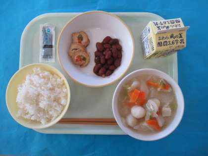 今日のメニューは、ごはん、ぎゅうにゅう、たいりょうなべ、やさいのにくまき、にまめです。たいりょうなべには、つみれやたらが入っており、とてもあたたまりました。