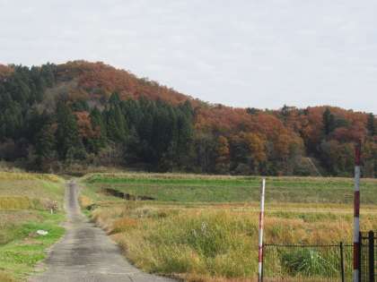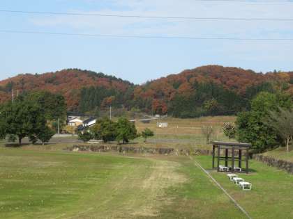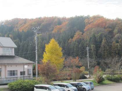 学校周辺の山々が紅葉で色づいていました。すてきな風景です。