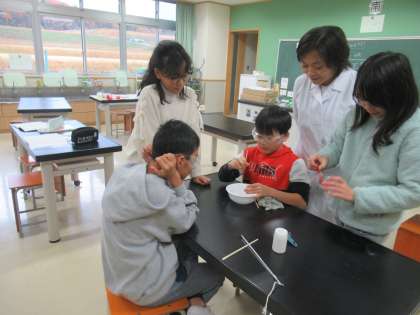 水の温度を変えてとかすとどれくらいとける?熱心に実験に取り組んでいました。