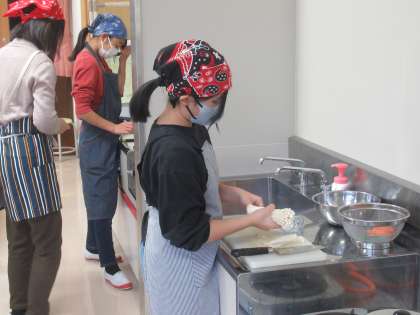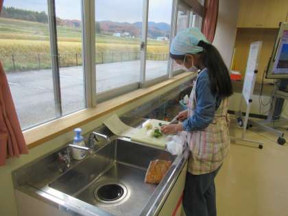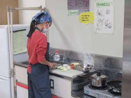 家庭科では、ソーセージやベーコンと野菜を使って調理実習に取り組みました。手際よく調理を行っています。