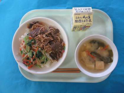 今日のメニューは、ごはん、ぎゅうにゅう、ビビンバ(やきにく、ナムル)、みそしるです。ボリュームあるビビンバに子供たちはもりもり食べていました。