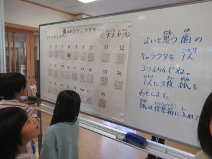 スポーツ保健委員会企画による歯みがき、てあらいのキャラクター募集では、すてきな作品が集まりました。子供たちは、自分のお気に入りを楽しそうに見つけていました。