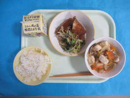 12月15日の給食は、ごはん、ぎゅうにゅう、あげざかなのみそだれ、こんぶあえ、はくさいなべでした。