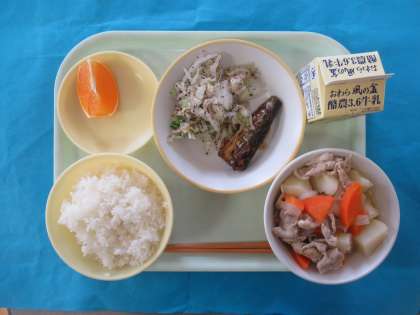 今日のメニューは、ごはん、ぎゅうにゅう、いわしのとさに、ゆかりあえ、しおにくじゃが、あいかです。あいかはあまみがつよく、とてもおいしくいただきました。