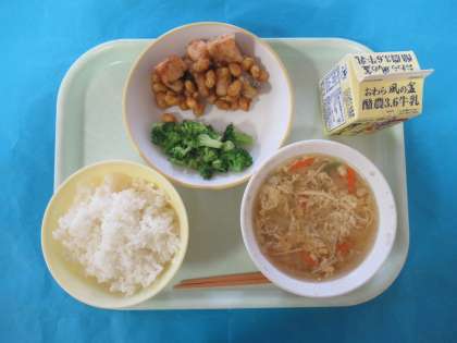 12月21日の給食は、ごはん、ぎゅうにゅう、さかなとだいずのねぎソースからめ、ゆでブロッコリー、ちゅうかかきたまじるでした。