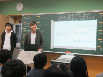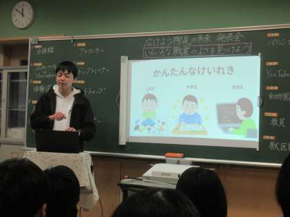 この日は、バーチャル樫尾小学校でお世話になっている会社の社長さんとプログラマーの方に来ていただきました。小学生の頃、日々のお仕事、これからの目標など話していただきました。