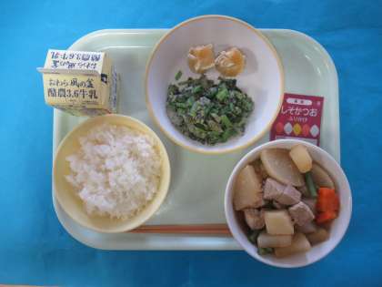 今日のメニューは、ごはん、ぎゅうにゅう、だいこんとぶたにくのにこみ、にんじんシューマイ、よごし、ふりかけです。よごしは、すったごまとはくさい、こまつながあえられており、あまいあじつけがおいしかったです。