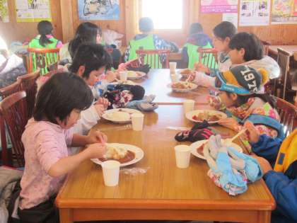 お昼はカレーライスをいただきました。スキー場で食べるカレーライスは最高でした。