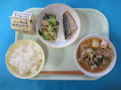 今日のメニューは、ごはん、ぎゅうにゅう、ぜんしゅうちゅうごまキムチなべ、さばのしおやき、ねばーるなっとうあえです。今日のテーマは、集中力アップこんだてです。キムチなどのはっこう食品にふくまれるGABAには、きもちを落ち着かせるこうかがあります。おいしくたべて、おべんきょうもがんばっていきましょう。
