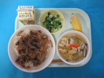 今日のメニューは、パワーぎゅうぎゅうどん(むぎごはん)、ぎゅうにゅう、ぐだくさんじる、ゆでブロッコリー、バナナです。今日は、きんりょくアップがテーマです。にんにくのもとになるたんぱくしつをたっぷりととることができました。とてもボリュームがありました。