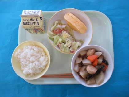 今日のメニューは、ごはん、ぎゅうにゅう、おでん、ベーコンとエリンギのソテー、あつやきたまごです。おでんは、あじがしみただいこんやこんにゃくをおいしくいただきました。