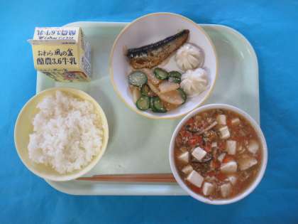 今日のメニューは、ごはん、ぎゅうにゅう、マーボーどうふ、えびパオツ、かふうあえです。エビパオツはおいしいあんがたっぷりつまっていました。