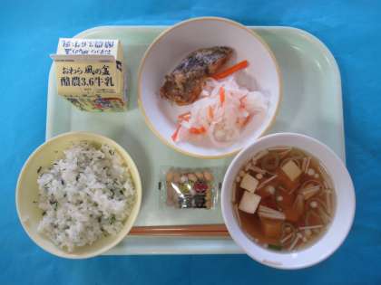 今日のメニューは、なめし、ぎゅうにゅう、すましじる、さかなのかばやき、なます、ふくまめです。なますはさっぱりといただきました。