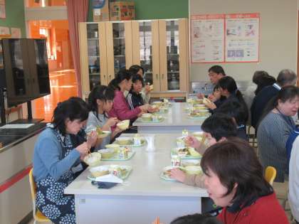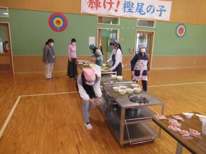 今日の給食は、全校会食です。子供たち、職員が集まって給食をいただきました。