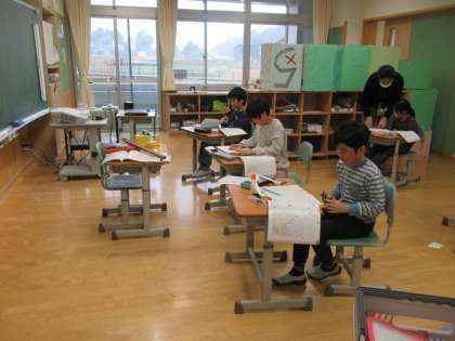 二等辺三角形のかき方について学習しました。コンパスを使って、丁寧にかいていました。