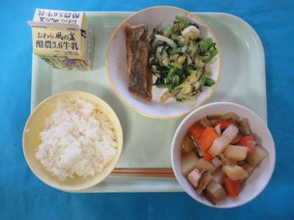 今日のメニューは、ごはん、ぎゅうにゅう、あげざかなのレモンあじ、いそあえ、やまとにです。あげさかなは、レモンふうみでおいしくいただきました。