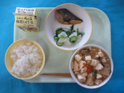 2月28日の給食は、ごはん、ぎゅうにゅう、ふくらぎのさいきょうやき、かぶのサラダ、えびととうふのうまにでした。